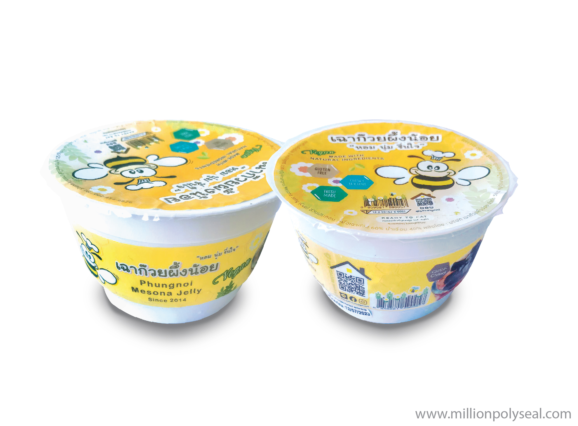 ฉลากหดรัดรูป วัสดุ PVC, PET shrink เหมาะสำหรับบรรจุภัณฑ์ทรงถ้วยหรือภาชนะที่พื้นผิวลื่น ภายในจะมีทากาวเพื่อเพิ่มการยึดติดภาชนะป้องกันฉลากหมุนหรือหลุดออก พิมพ์สีสดและแม่นยำตาม PANTONE ที่กำหนด สามารถพิมพ์ตัวอักษรที่เล็กขนาด 1 pt ได้